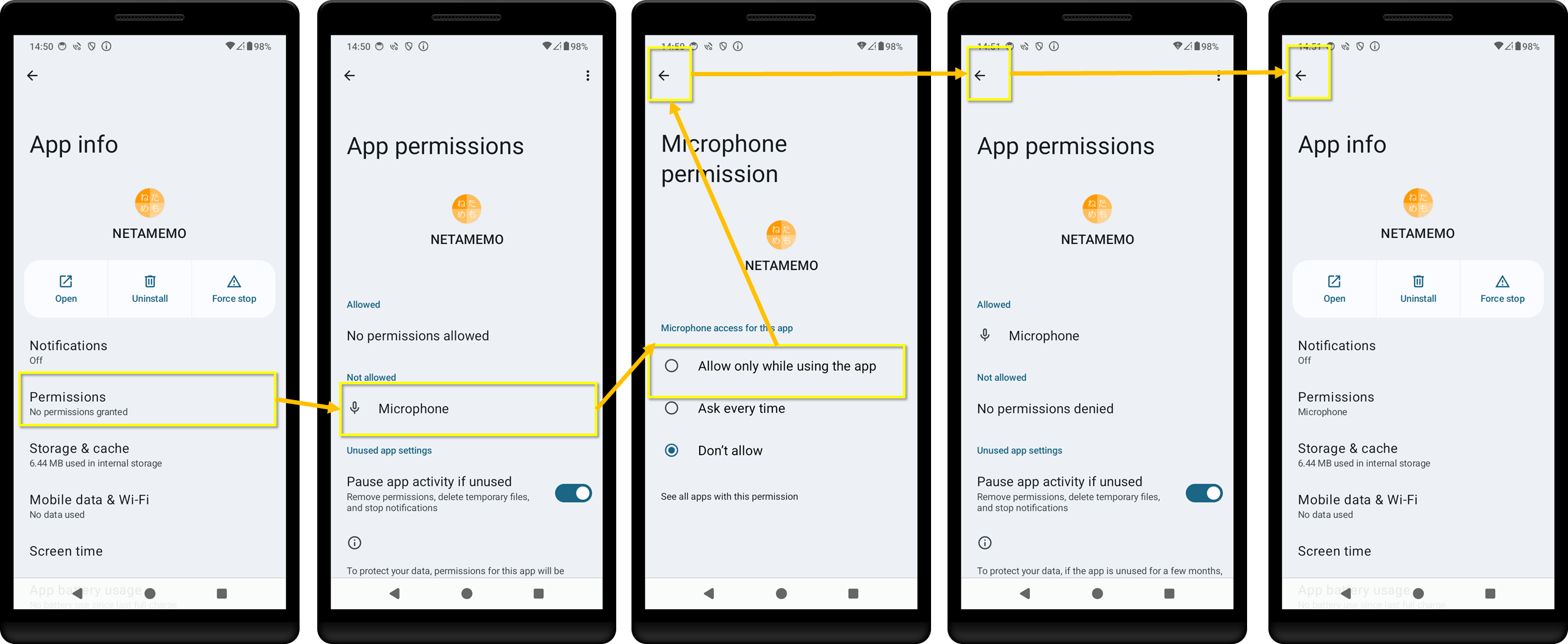 Tap [Permissions], tap [Microphone], and then tap [Allow only while using the app].