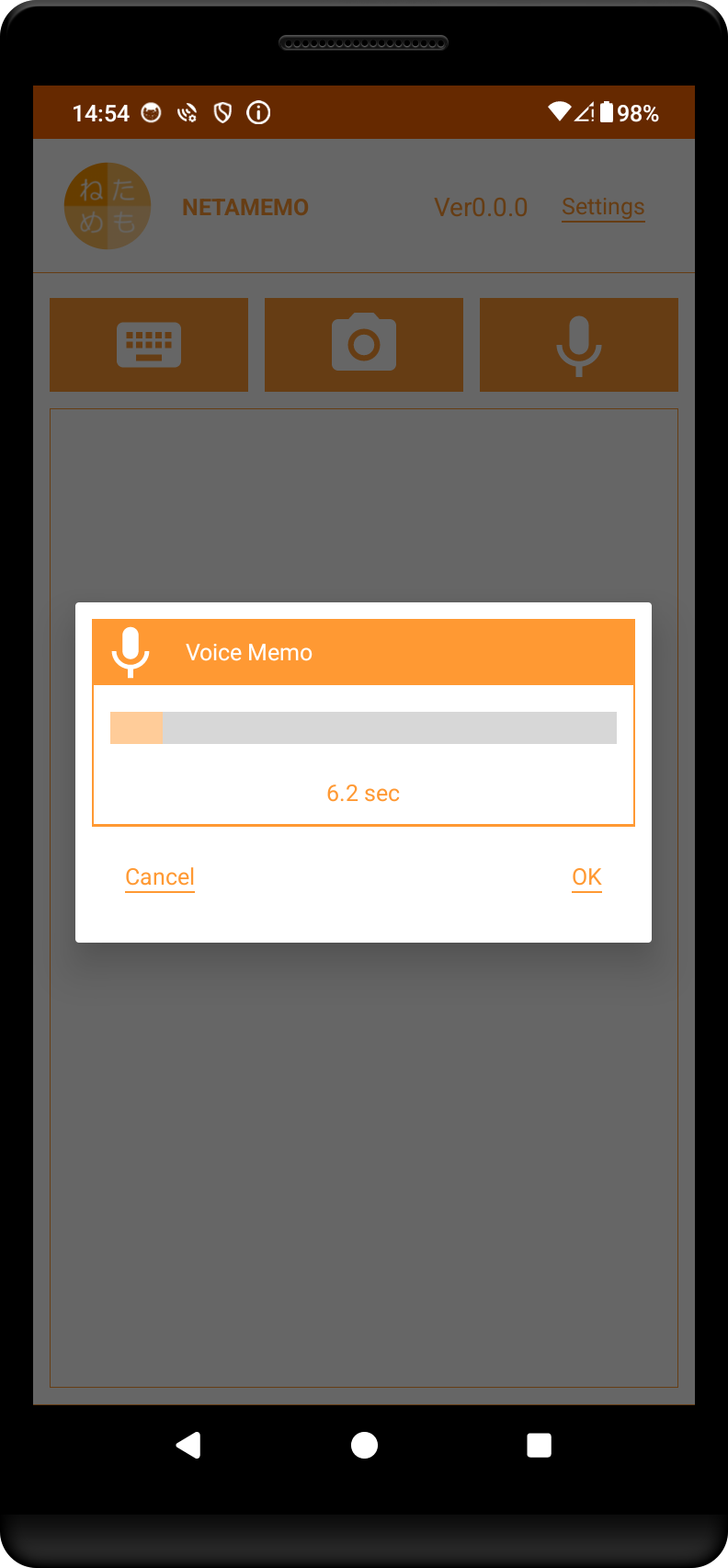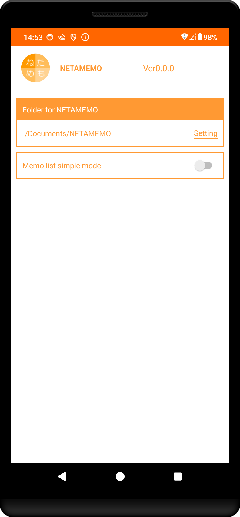 This app saves "Text Memo", "Photo Memo" and "Voice Memo" in files. "Folder for NETAMEMO" is the folder setting to save them. This is a required setting. Tap [Settings] and select the folder.