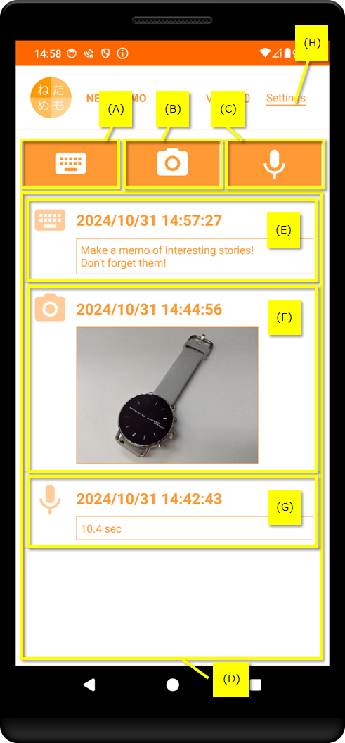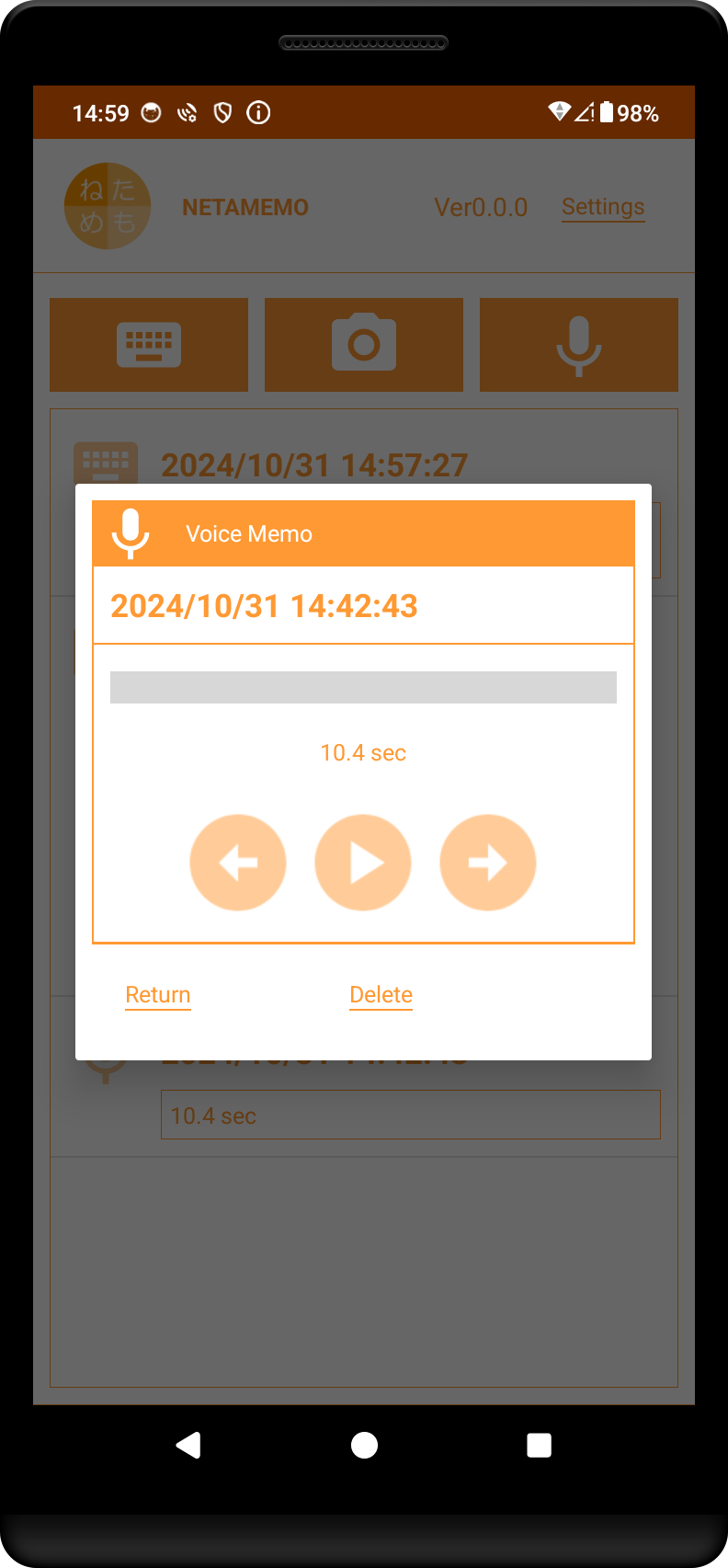 When you start the app, the main screen will appear immediately, and if you have any registered memos, they will be listed in descending order of the date and time they were registered.