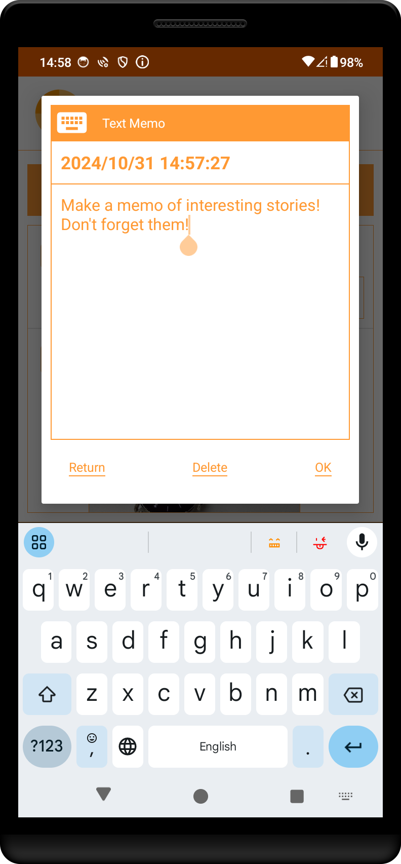 You can enter text memo using the software keyboard. You can also enter line breaks.